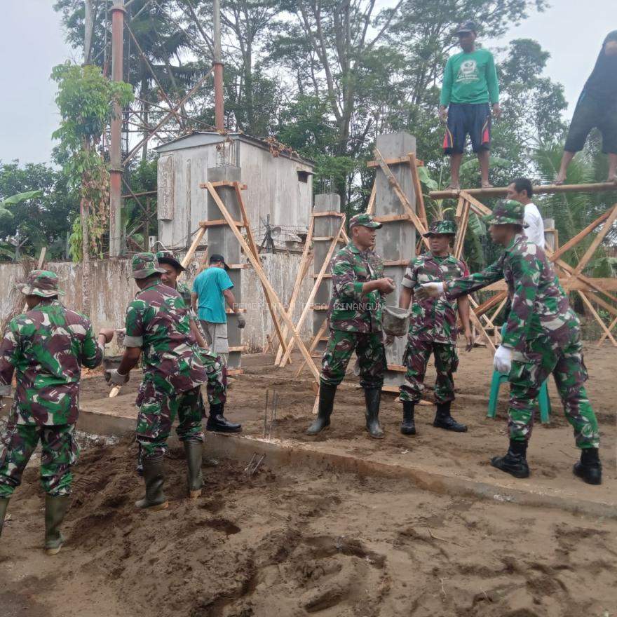 Dalam kegiatan tersebut, anggota Koramil 0703-04 Binangun bersama warga sedang melakukan pekerjaan pada pengecoran pilar atau tiang tiang utama penyangga atap dengan campuran semen, sirtu, air dan pengeras beton menggunakan mesin pengaduk semen/molen mixer milik desa.